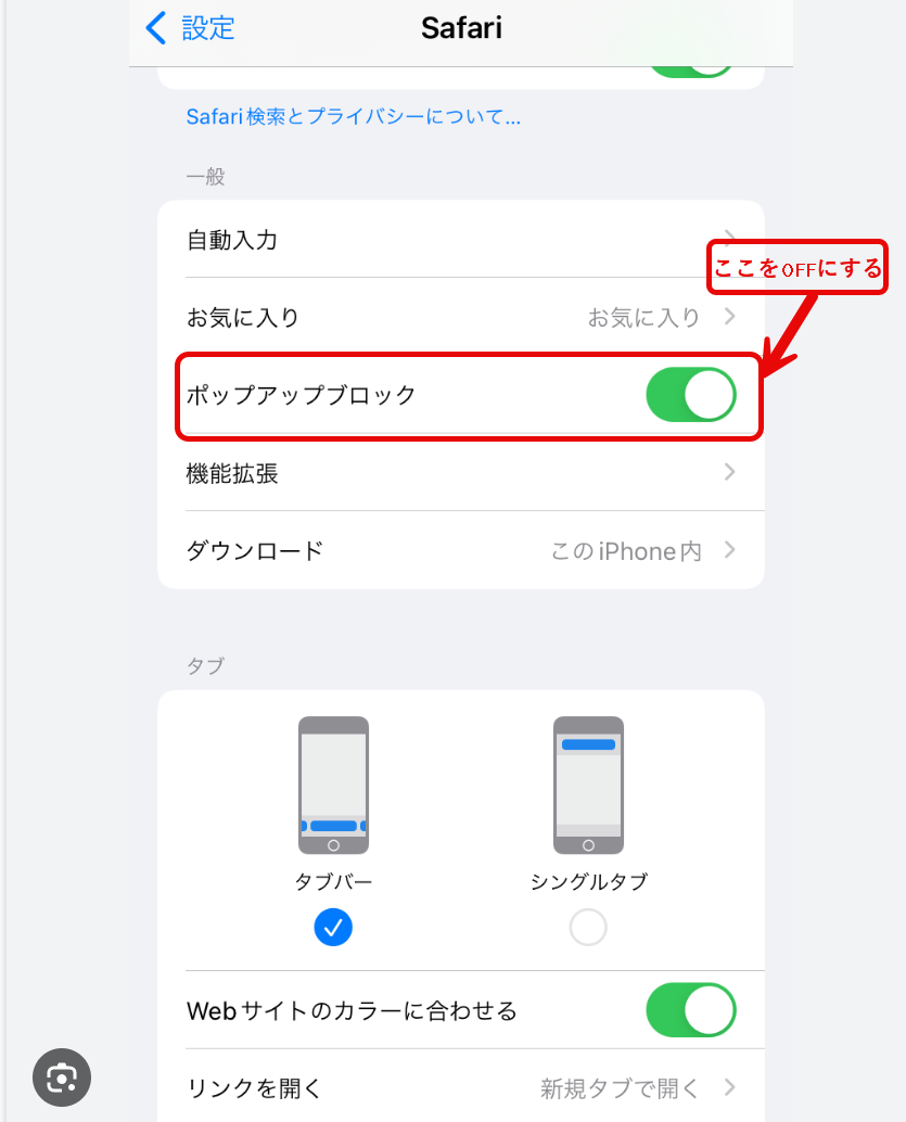 iPhoneで「設定」>「アプリ」>「Safari」の順に選択し、「一般」の項目内にある「ポップアップブロック」をOFFにしてください。(緑バーがonの状態。下記写真はONの状態ですので、緑バーを外し、OFFにしてください。